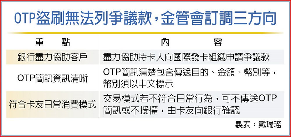 最後銀行局定調三大方向,一是銀行要站在客戶的立場,盡力協助持卡人申請爭議款,還是有申請成功過的案例;二是銀行傳送的OTP簡訊資訊要清楚,包含傳送目的、金額、幣別等,預計第二季上路。