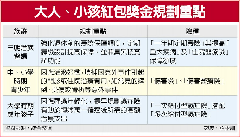 壽險業者建議,面對外界未知的風險,可趁現在規劃一份最適合自己與孩子的保障,讓大人小孩一起用紅包與獎金安心贏在起跑點。。圖/本報資料照片