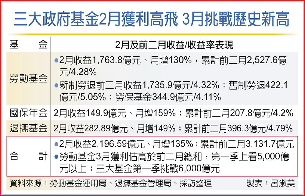 三大政府基金2月獲利高飛 3月挑戰歷史新高
