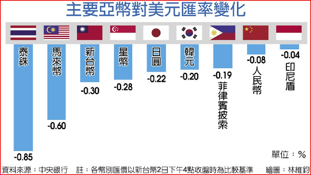 據央行統計,主要亞幣以泰銖狂貶0.85%最多,其次是馬來幣下殺0.6%,新台幣重挫0.3%、新加坡幣貶0.28%、日圓下跌0.22%、韓元貶0.2%、菲律賓披索貶0.19%,人民幣及印尼盾各小貶0.08%及0.04%。