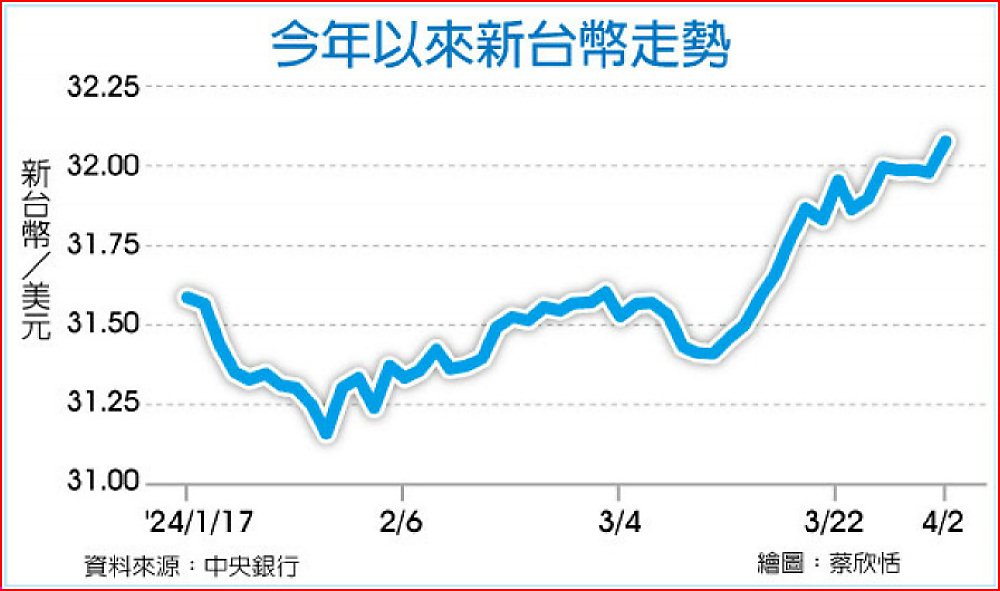 匯銀主管分析,聯準會降息預期再延後,美元走強,亞幣全倒,央行順勢而為放手32元防線;本周有清明連假,匯市僅三個交易日,外資可能趁周五美國非農數據公布前資金先匯回防守,3日新台幣續貶機率偏高,若後續站穩32元,下一步將測試32.2元關卡。目前雖都走貶,但低檔仍有撐,主要是人行及日本央行已口頭干預,若二幣別未破底,新台幣節後應不會出現崩跌補貶。