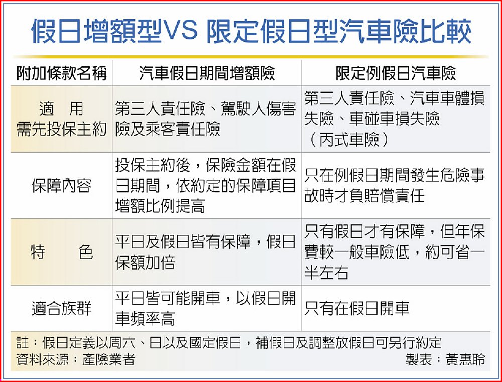 假日增額型VS 限定假日型汽車險比較