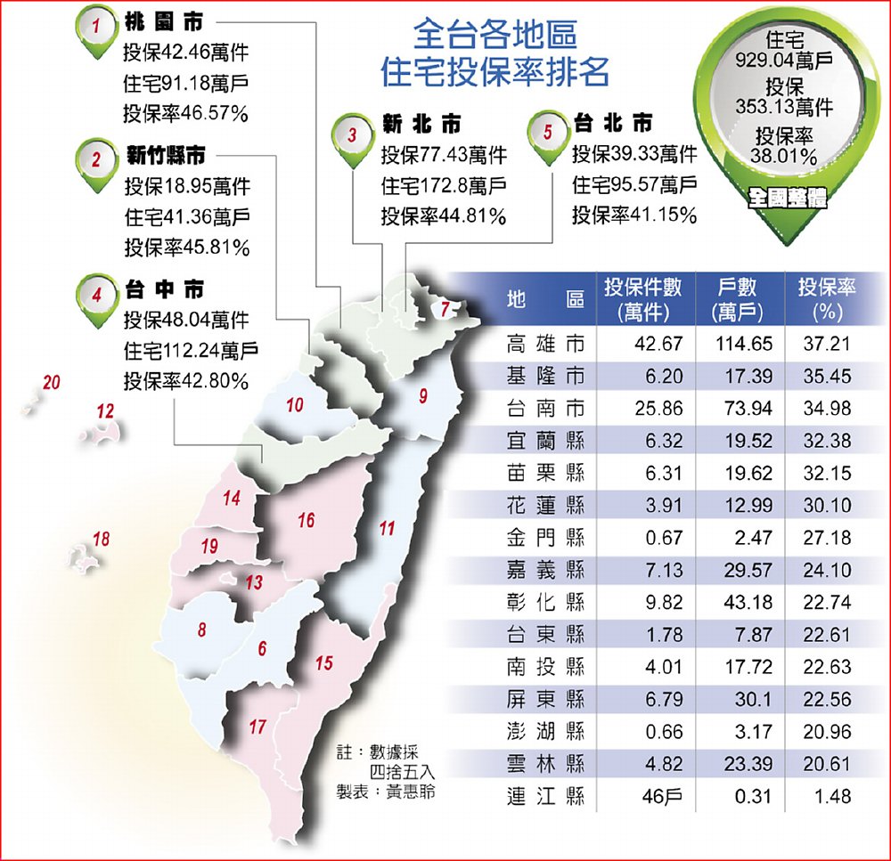 全國投保率最高是桃園市46.57%、其次是新竹縣市的45.81%,亦是全台唯二投保率破45%的地區,分析是這兩區新建案多,房貸戶也多,拉高投保率。至於投保率突破4成還有新北市有44.81%、台中市是42.8%及台北市的41.15%。六都中的高雄市投保率為37.21%,台南市為34.98%等,都低於全台平均投保率。