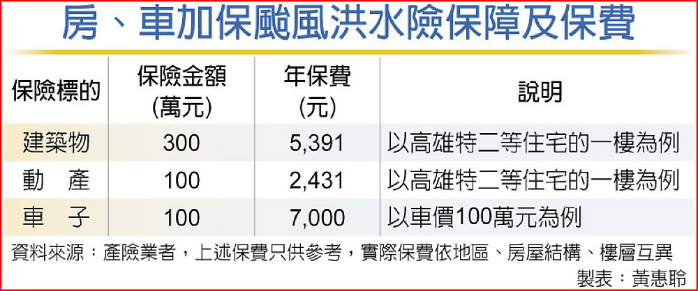 明台產、富邦產、國泰產等多家產險均表示,遇到地震時,車輛被掉落的冷氣、磁磚砸毀,只要車輛有附加颱風、地震、海嘯、冰雹、洪水或因雨積水附加條款,就可以獲得理賠。據了解,若以百萬元車計算,颱風洪水險的年保費約7,000元左右。