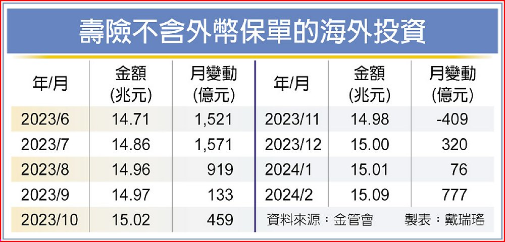 統計至2月底,壽險業海外投資市值超過22兆1,480億元,若不計入外幣保單部位則為15兆924億元,市值應為史上新高,但因避險成本昂貴,使得海外投資速度放緩。前兩個月海外投資共增加853億元,已連續七個月單月增加低於1,000億元,去年6月、7月單月各增逾1,500億元,顯見速度趨緩許多。