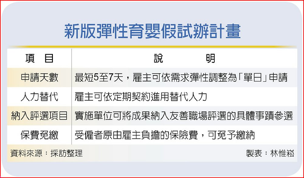 許銘春表示,勞動部今年初曾邀集公私部門召開會議,與會代表均認為,應給予更多彈性與空間,不要有太多強制性。因此,試辦計畫進一步讓勞工申請5日或7日的育嬰假,若企業願意,單日也可以申請。目前包括台糖、台電、中油、勞動部所屬機關等,以及民間企業共63家參與試辦,從6月起至12月底起試辦。