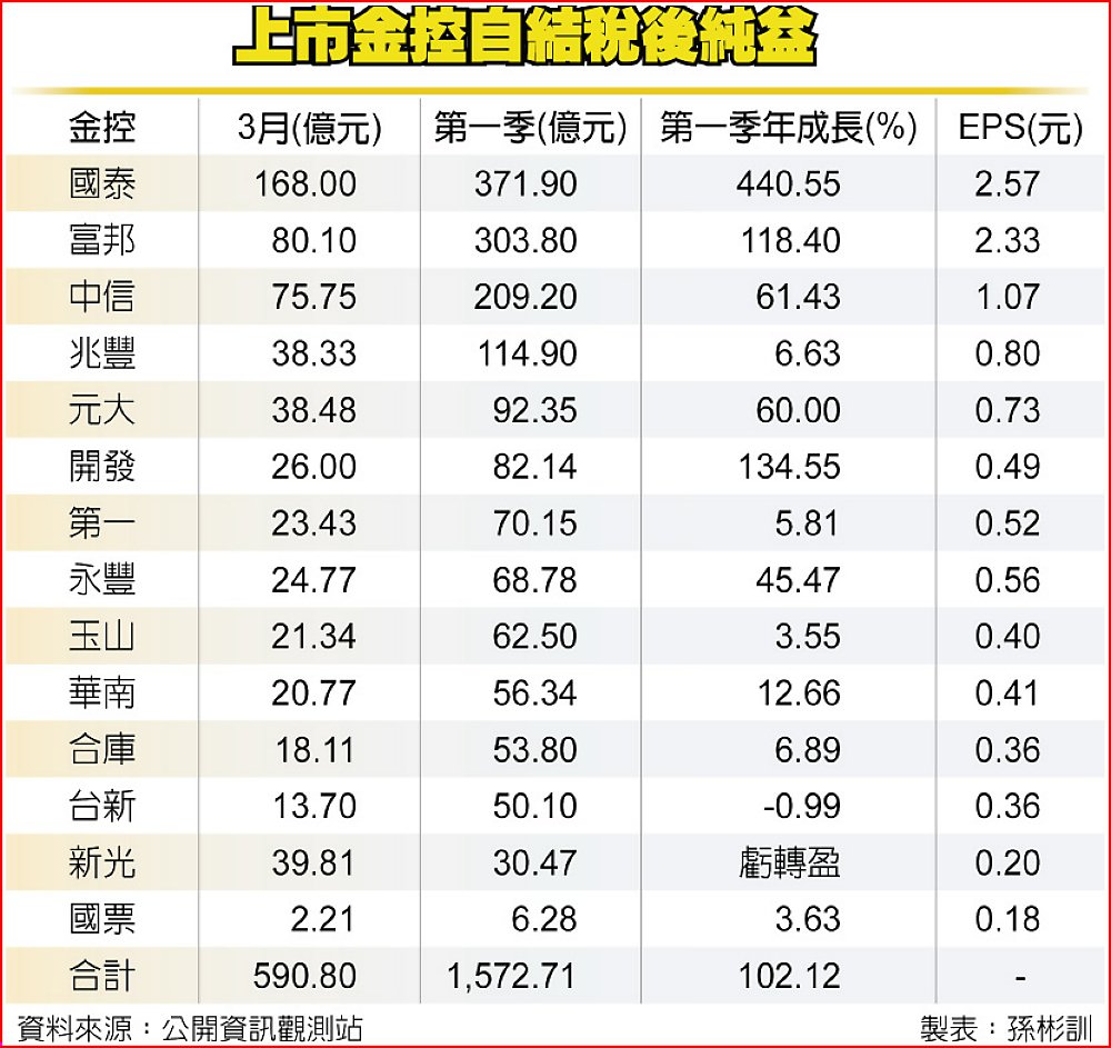 金控主管分析,金控首季獲利中,銀行持續穩定向前,壽險則是穩健向上,證券也因股市熱絡而受惠,有大型券商的金控首季獲利亦表現不錯,兆豐金首季稅後獲利近115億元,排名第四,元大金則以92.35億元暫列第五,首季已有四家金控進入獲利百億元俱樂部,若台股續旺,估計4月亦會有金控再晉級