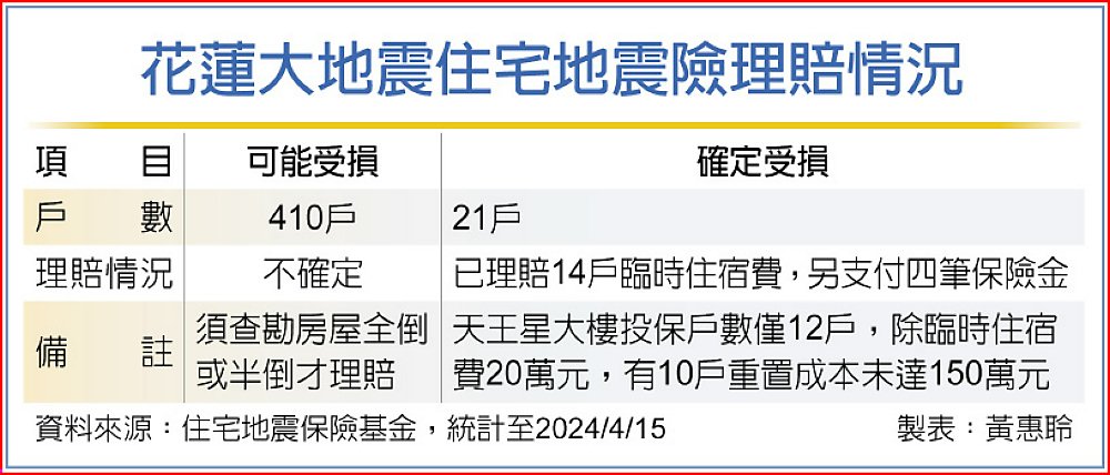 截至15日為止,確定符合全損標準保戶只有21戶,其中12戶是花蓮天王星受災戶,且天王星大樓受災保戶中,有10戶重置成本不到150萬元,換言之,實際得到理賠金會低於150萬元。