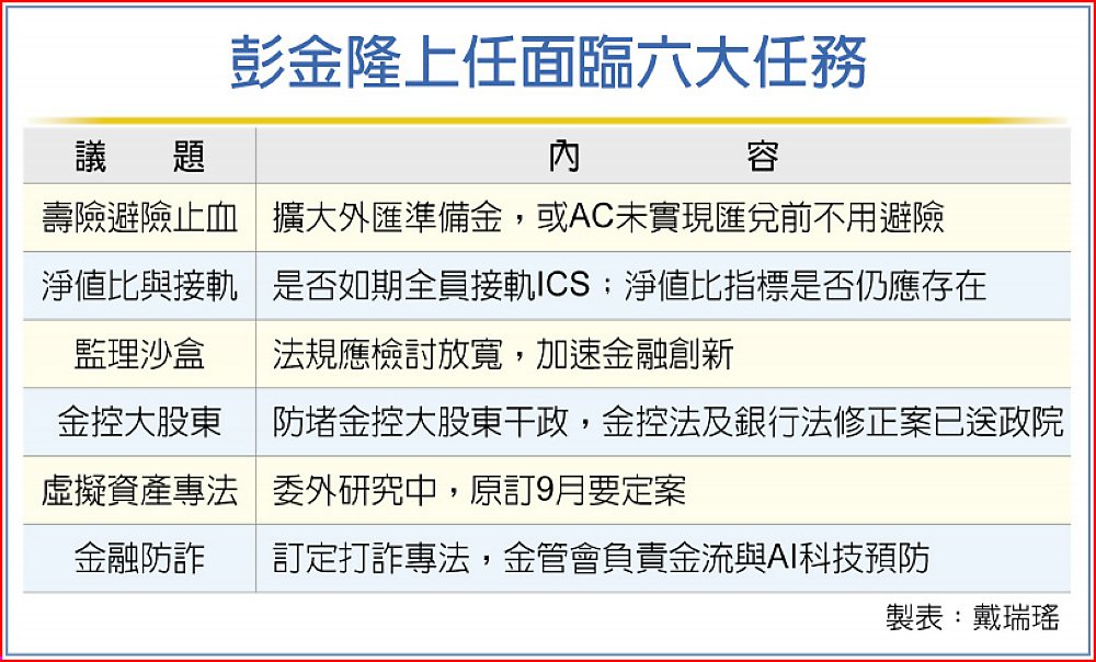 四是彭金隆是金控法專家,早期曾參與、協助政府制定金控法,近年金管會防範金控大股東「干政」,在他上任後能否持續維持監理力度,繼續推動金控法及銀行法修正案,還是會轉向,亦受到金融業關注,還有後續包含虛擬貨幣專法、租賃業納管、金融防詐等,也將是外界矚目的政策焦點。