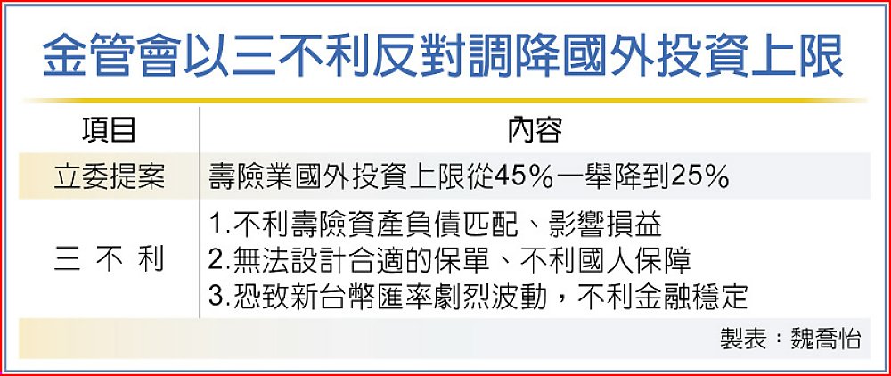 這是立委羅明才等提案修正保險法第146之4條,將保險業國外投資上限由現行45%降為25%,以引導保險資金回台投資,帶動產業升息、創造就業機會及提高薪資等,法案下周一(22日)將在財委會初審,金管會極力建議「不修正」。