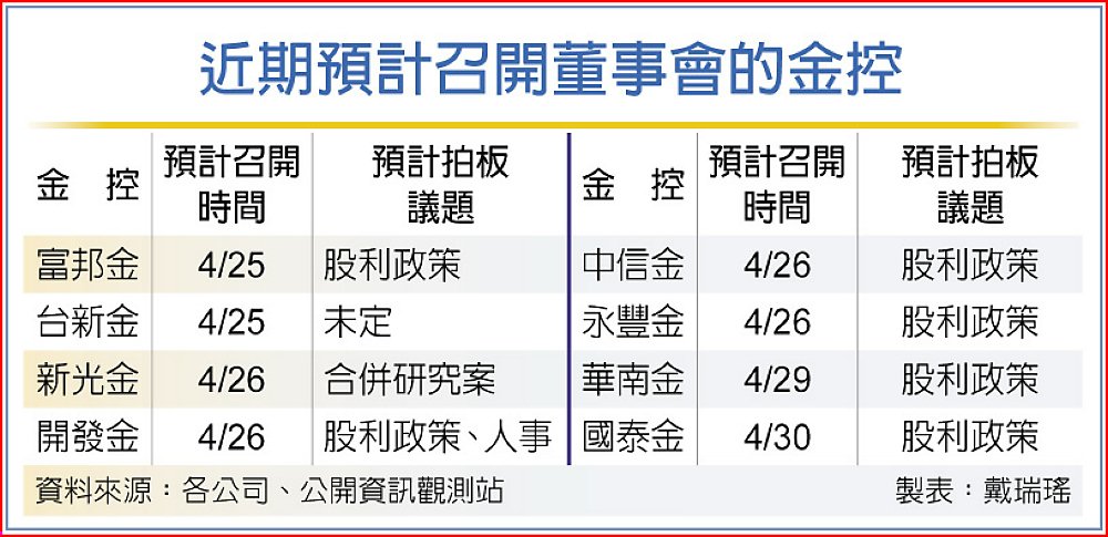 富邦金、台新金25日召開董事會,市場預估富邦金今年現金股利加股票股利上看3元,華南金、國泰金預計29日、30日召開董事會,金控股利陸續拍板,將成金融股上漲新動力。