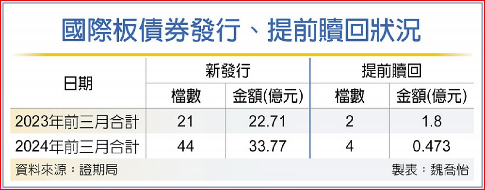 由於目前市場持續維持高利率,債券提前贖回再發行不划算,因此今年提前贖回量不多。證期局統計,今年首季可執行提早贖回的國際板債券共83檔、金額120.52億美元,但實際贖回只有4檔、金額0.473億美元,占比極低。