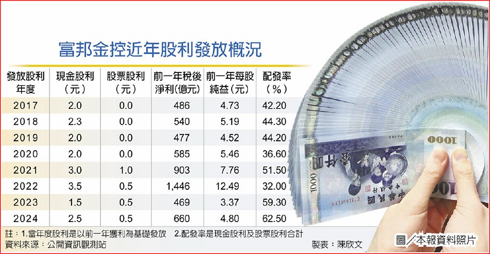 富邦金在2022年配發2021年股利時,每股配3.5元現金及0.5元股票,今年配發每股3元股利,雖不及前年,但是相較去年因債券跌價、金融資產有評價損失時,每股配2元,現金股利增近67%,整體股利成長50%,已反應去年獲利成長36%的水準,且股利總配發率超過6成及現金發率逾52%,均比去年的56%以及過去13年來平均現金配發率近4成的水準要高,為爭取投資人認同,顯得相當有「誠意」。