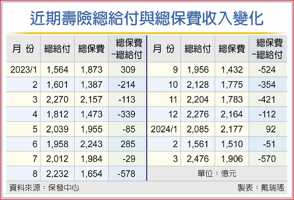 因此3月壽險給付拉上2,476億元,創下史上單月新高,15個月來單月總給付再度飆上2,400億元,年增近1成,主要給付金額多來自壽險與年金險解約。3月總保費收入有1,906億元,單月保險淨流出570億元,是去年9月以來新高。