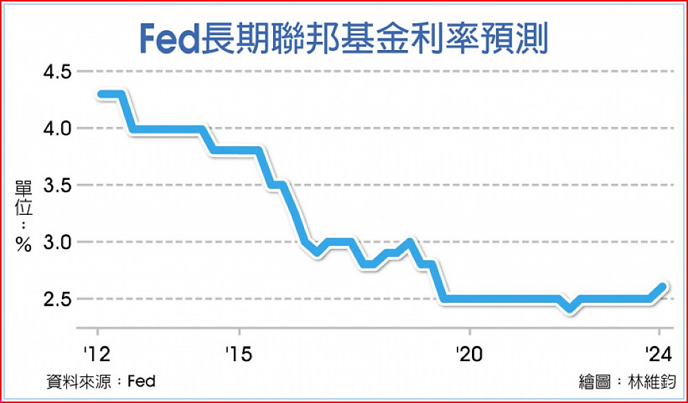 每個季度,Fed官員都會對長期利率進行預測,這可視為他們對中性利率的推論。2008年金融危機後,Fed下調對於長期利率預估,從2012年的4.25%降至2019年的2.5%,扣除2%通膨率後,實質中性利率則為0.5%。