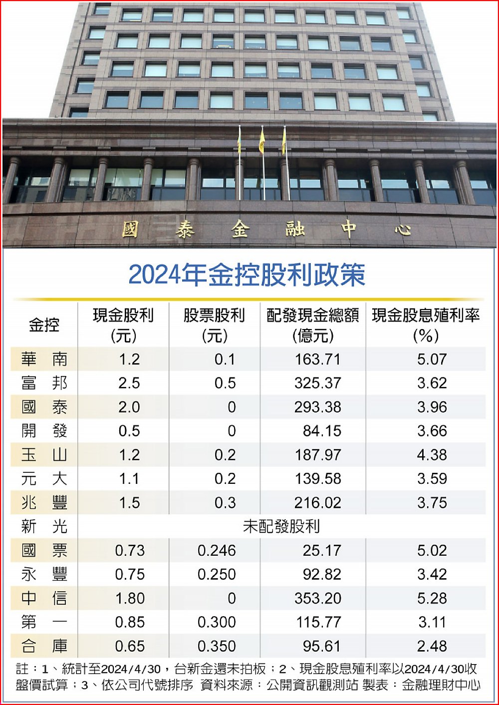 14家金控中,目前以富邦金每股配現金股利2.5元、股票股利0.5元,共3元,暫居金控股息股利金額最高者,其次是國泰金每股現金股利2元。以30日收盤價計算現金殖利率,則以中信金的5.78%暫居最高,其次是華南金的5.07%。另就現金股利配發率來看,目前以國票金的126%最高,其次是玉山金85%。