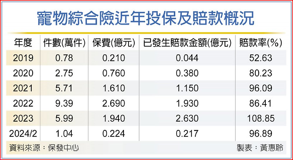 國泰產險截至今年2月底,今年承保件數逾2,300件,保費超過1,000萬元,新保件提供7歲以下犬貓投保,續保最高可至14歲。國泰產指出,目前損率尚屬可控,後續持續關注市場損率概況及商品分析比較,並定期就承保範圍、理賠金額、理賠原因、商品結構及商品保費等作檢視,同時也會隨著客戶投保需求,適時調整商品內容。