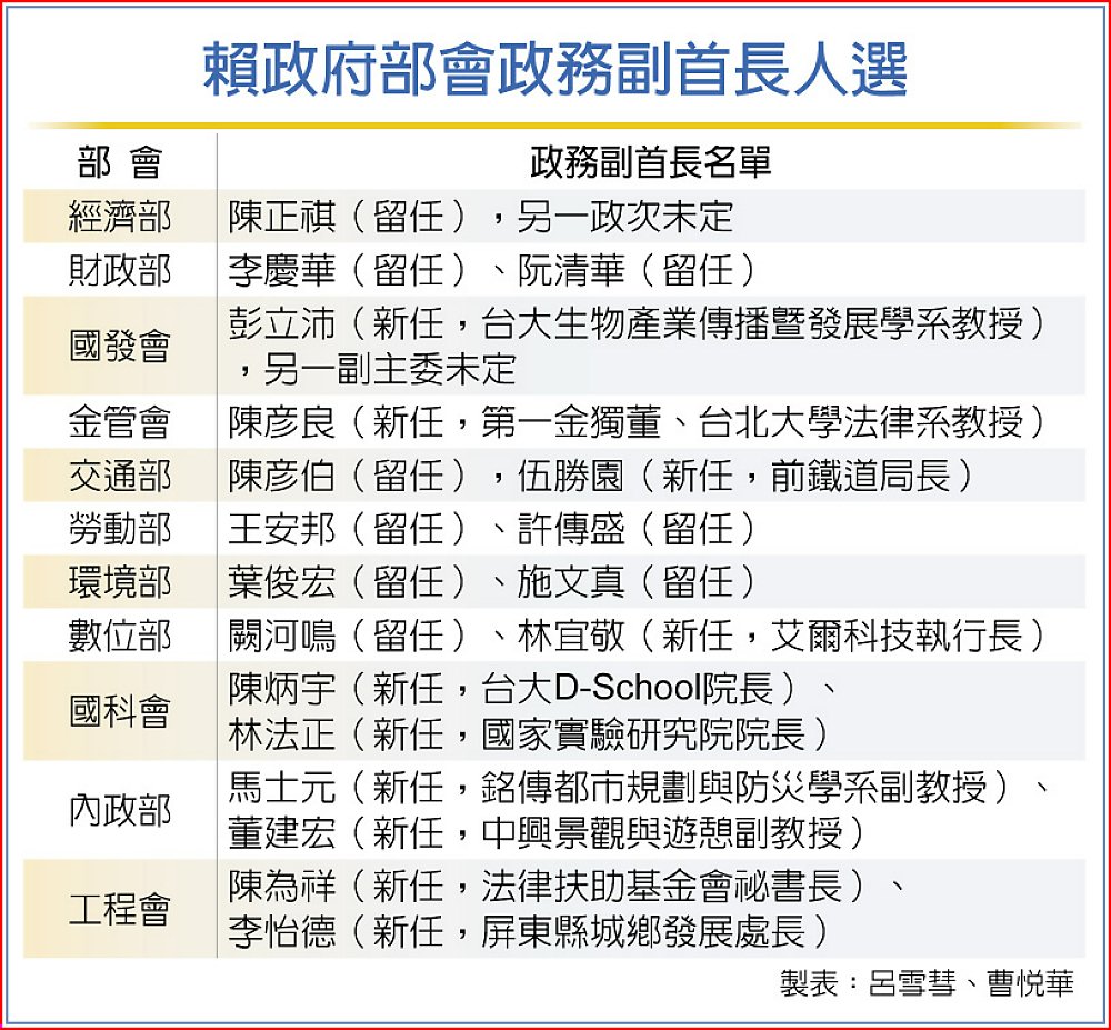 陳彥良連同主委彭金隆年齡都未超過60歲,可預見金融監理將年輕化,加上現任常務副主委邱淑貞出身銀行局基層,三位首長在銀、保、證及金控專業齊備。內政部二位政次均為新面孔,包括銘傳大學都市規劃與防災學系副教授馬士元,以及中興大學景觀與遊憩碩士學位學程副教授董建宏。數發部另一政次由艾爾科技執行長林宜敬出任,交通部另一政次由前鐵道局長伍勝園出任。國科會及工程會二位政務副主委均新人,分別是台大D-School院長陳炳宇及屏東縣城鄉發展處長李怡德。