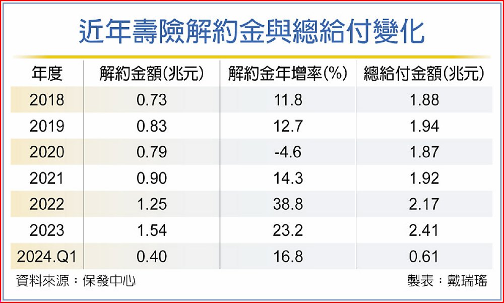 第一季給付金額增加,主要就來自解約金增加,第一季解約金額4,046億元,較去年第一季增加583億元,年增率近17%。若美國遲不降息、新台幣不升值,今年解約金仍可能再增加,從2022年開始,解約金可能連續三年破兆元。