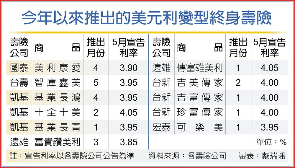 今年至5月初,至少有六家壽險推出新的美元利變壽險保單,張數至少逾11張,今年1月推出的美元利變壽險至少就有5張。依各壽險公司5月宣告利率,新的美元利變壽險宣告利率普遍在3.95%,有5張高於4%,最高來到4.05%。