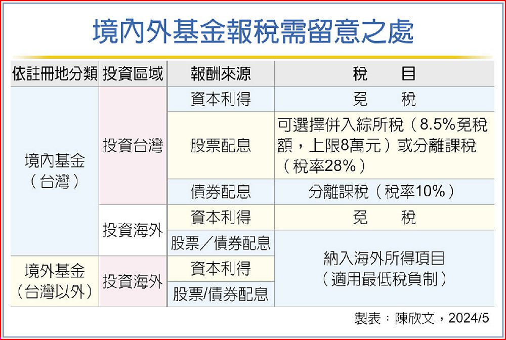 基金業者表示,買賣註冊地在台灣的境內基金,產生資本利得目前免稅。至於基金配息,如來源為投資國內的股票,可選擇併入綜合所得稅或分離課稅,併入者享免稅額8.5%、上限8萬元,分離課稅稅率則為28%;如來源為投資國內的債券,則採分離課稅,稅率10%。