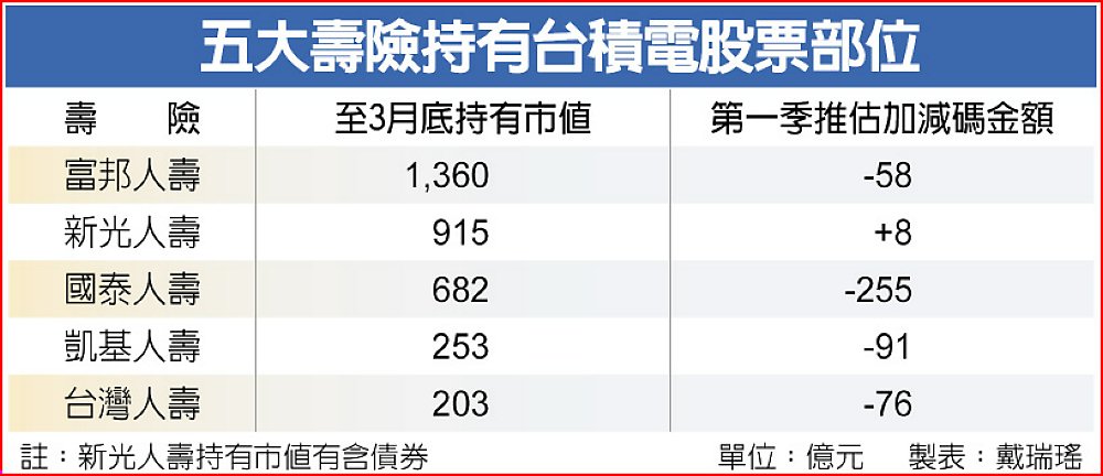 除南山人壽,金控下五家大型壽險中有四家首季減碼台積電,規模約480億元。業者表示,首季雖有新台幣貶值的兌換利益,但避險工具及提存準備金成本仍高,還要支應本業經營成本,滿手債券又多是跌價損失,第一季能「變現」的只剩下股票,其中又以台積電獲利較豐。