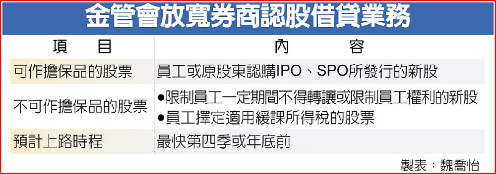 高晶萍表示,這是證券商公會建議開放的措施,過去上市櫃公司在初次掛牌(IPO)、現金增資(SPO)發行新股,員工及原股東依比率認股時,若有資金需求都是向銀行借信貸或房貸,亦或賣出手中股票變現、繳款。