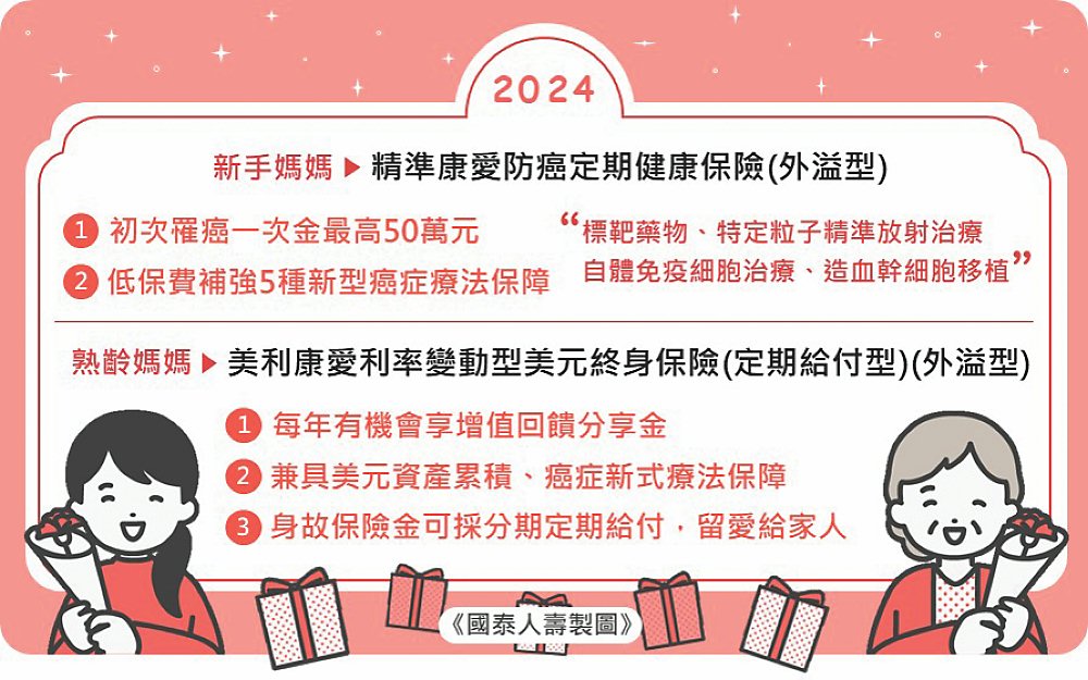 針對熟齡媽媽方案,身為三明治族的熟齡媽媽們承擔著雙重責任,需要在照顧年邁雙親與關注孩子的成長間來回奔波,但任何的傷病都可能帶來沉重的財務壓力;因此國泰人壽推薦「美利康愛利率變動型美元終身保險(定期給付型、外溢型)」,以45歲女性投保保額10萬美元,繳費10年期,選擇增額繳清為例,10年總繳保險費約123萬元,若在第10保單年度罹患癌症(重度),且以特定5項新式療法治療,可 有約340萬元的特別治療金;若一生平安健康至70歲時,累積保單現金價值約199萬元,反之若不幸身故,能夠請領約360萬元的身故保險金。