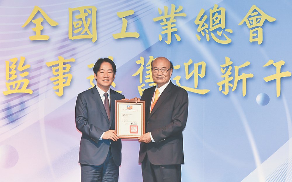 工業總會8日舉行理監事送舊迎新午宴,總統當選人賴清德(左)受邀出席並頒發當選證書予理事長潘俊榮(右)。圖/王德為