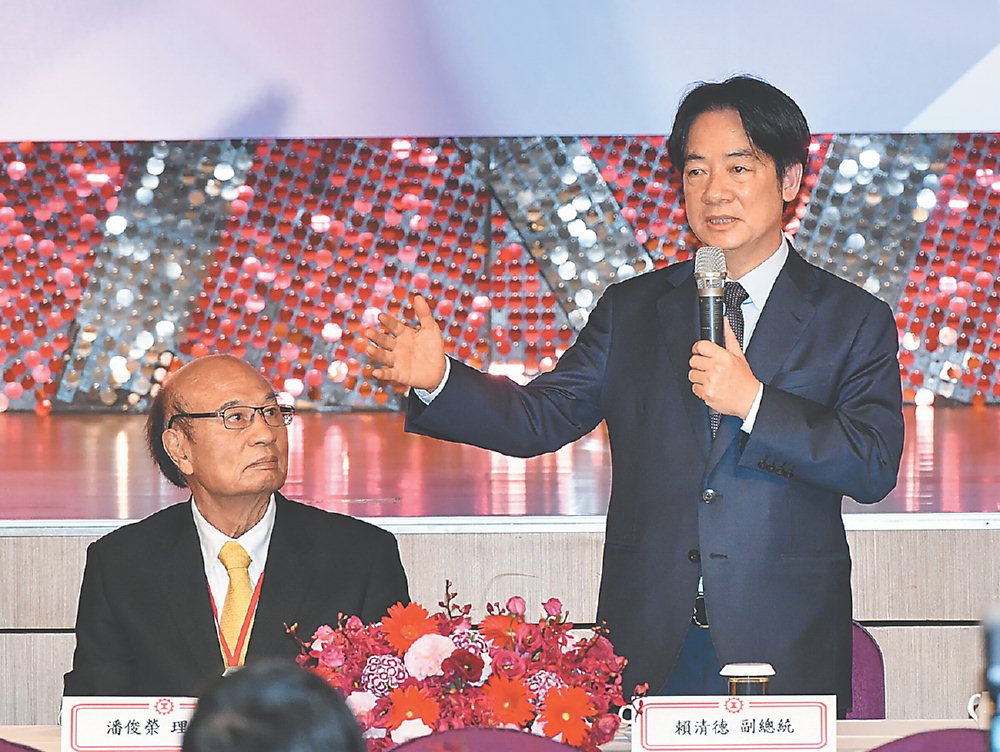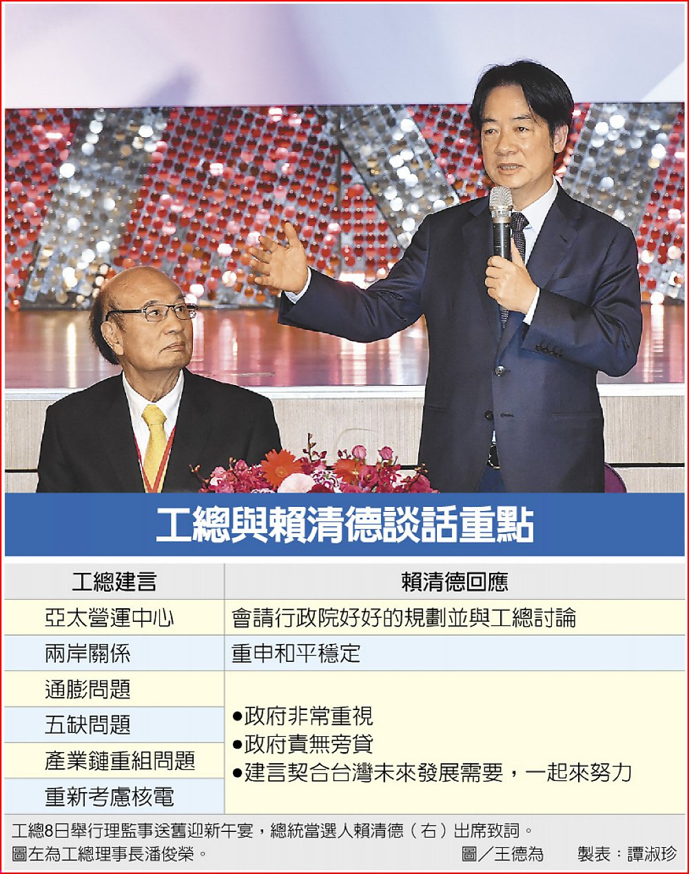 工總與賴清德談話重點 ●工總8日舉行理監事送舊迎新午宴,總統當選人賴清德(右)出席致詞。圖左為工總理事長潘俊榮。圖/王德為