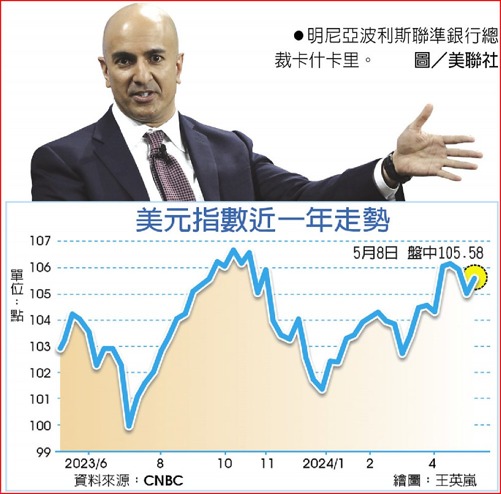 追蹤美元兌一籃子貨幣表現的美元指數8日止跌回升,最高一度來到105.64,上漲0.2%。之前由於美國降息延後,美元指數強升至6個月高點。