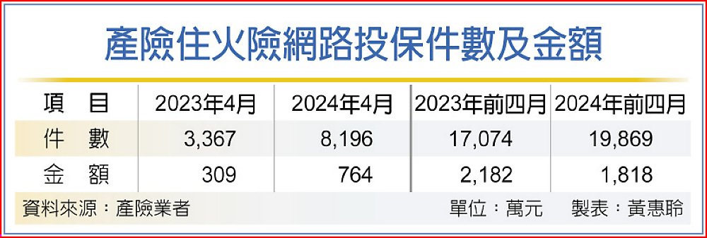 4月除網路投保住宅火險件數、保費上升,依產險業者統計,4月住宅火險保費2.02億元,也較去年同期1.83億元,大幅成長10.4%,也是近年來單月新高;前四月累積住宅火險保費為7.53億元,較去年同期7.18億元,年增只有4.8%,顯示0403大地震讓不少民眾留意到投保住宅火險重要性。