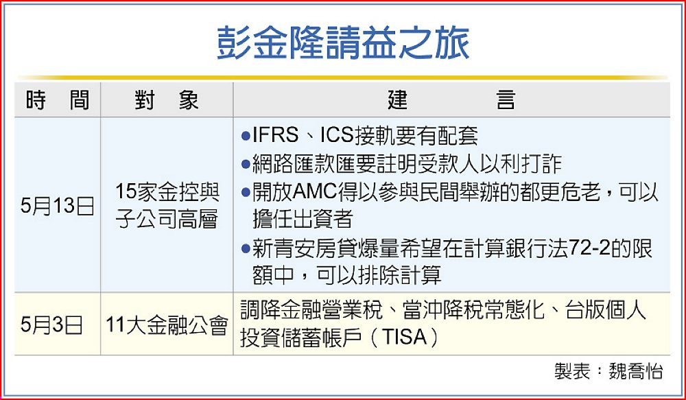 520將上任的準金管會主委彭金隆請益之旅,13日再與15家金控有約,會議進行約2個半小時。圖/本報資料照片