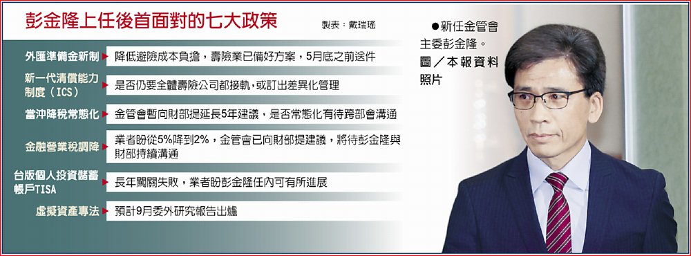 壽險公會將建議能快速累積外匯變動準備金的方式,同時拉高沖抵比率,有利各公司逐步降低避險比重,就等彭金隆一上任、5月底前建議案送進金管會,可望成為彭金隆上任後第一項需拍板的利多政策。其次是壽險業2026年接軌ICS已近收尾,某家大型壽險公司內部計算,在2025年底前就需增資逾千億元才可能達標,也有多家表示試算未過,都需要增資,壽險業內部傳出是「可再延後接軌」、「或不需要每家都適用同一標準」,建議金管會訂出差異化管理的可行性。