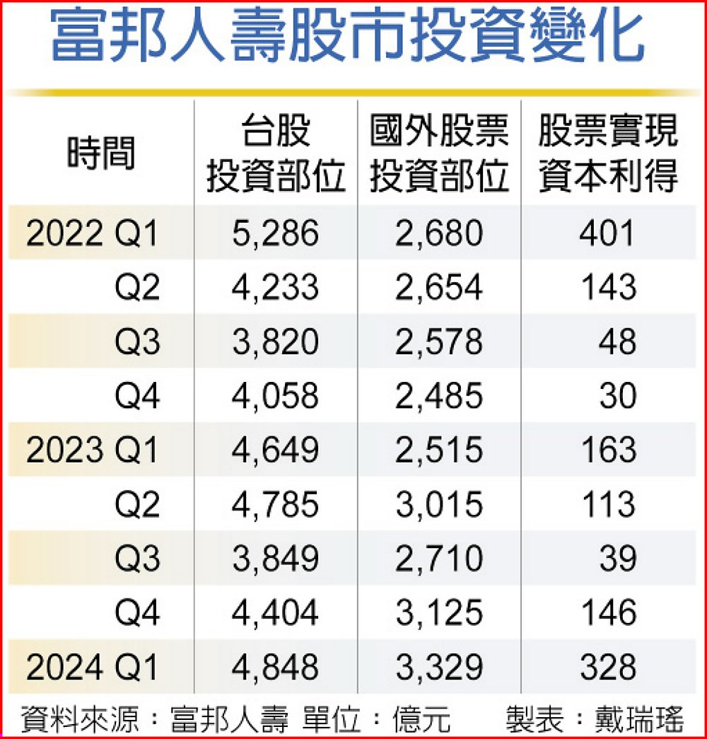 反應全球股市上漲,股票價值增加,3月底富壽持有台股市值達4,828億元,同樣是八季新高,台股占富壽總投資部位的9.7%,國外股票部位亦拉高到新台幣3,329億元,創富壽國外股票投資金額的季底新高,合計國內外股票占比達16.4%,同樣是八季以來新高比率。