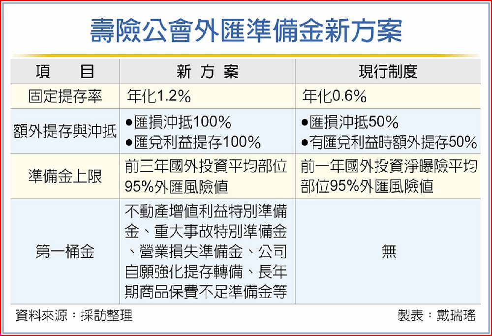 壽險公會提出的外匯準備金新方案,將拉高外匯準備金提存及可沖抵比率,並「借一桶金」快速累積外匯準備金,以換取逐步降低避險比重。