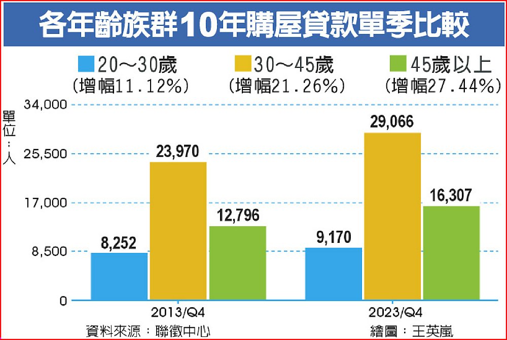 公股銀分析,依國發會的人口推計數據,台灣人口結構已明顯轉呈高齡化,人口紅利預估在2028年消失,即15歲~64歲的人口低於三分之二。目前申辦房貸年齡,超過8成是30歲以上,其中30歲~45歲占6成,若新增人口數逐年下降,社會老化速度嚴重,主要購屋族群逐漸老化或減少,恐為後續房市成交量帶來負面影響。