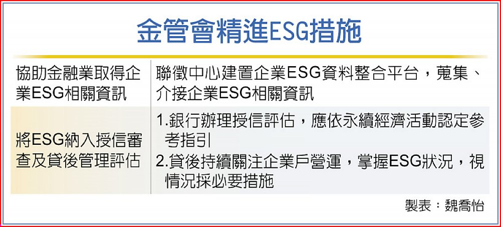 在金管會書面報告指出,過去發生不少工安、食安事故,外界認為銀行吸納大眾資金,也應將ESG因素納入授信審查及貸後管理評估,包括質化或量化評比,金管會已督導銀行公會提具兩大強化機制。