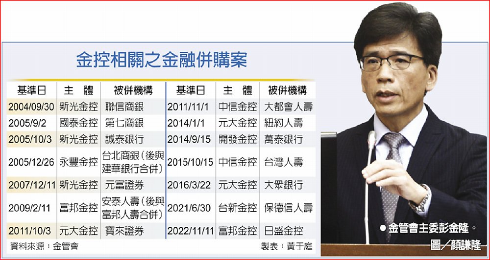彭金隆指出,金控法本就設計有整併相關機制,金控經主管機關許可者,可與另一金控整併,任何金融機構有都有入場、退場的規定,會尊重市場機制,但因金控規模大,合併不僅牽涉到市場競爭與安定,也需公平會同意等,在還沒有收到正式申請文件前,金管會不能評論。