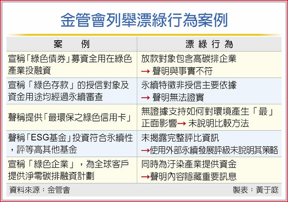 金管會明確定義「漂綠」,即金融機構在永續相關的聲明、行動或陳述中,提供無法讓人清楚理解或過於誇大的訊息,或僅選擇性揭露正面影響、或缺乏證據支持其永續特徵的訊息,進而誤導金融消費者、投資人或其他市場參與者的判斷。