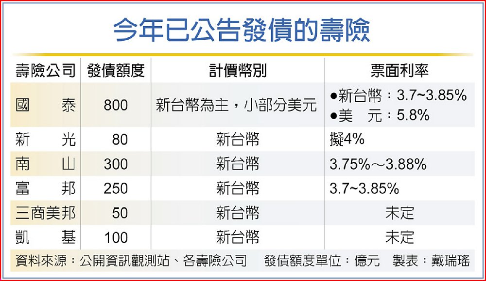 今年早已宣布發債的新壽,原訂額度80億元,以新台幣為主,但必須找銀行保證,上半年預計先有55億元到位,後續還有25億元額度,持續尋求銀行保證中,票面利率預估與去年相當、接近4%。