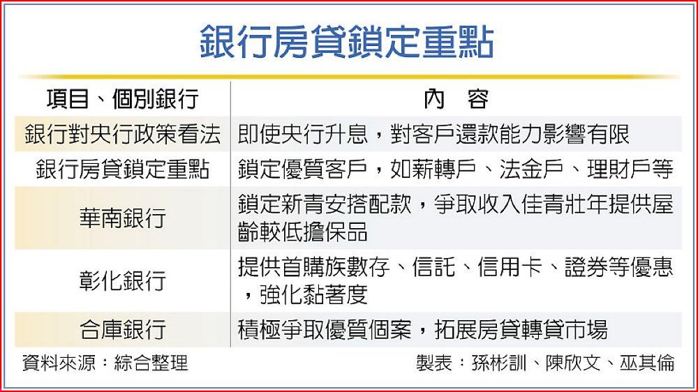 土銀開發優質房貸客源,深耕以自用住宅為主的房貸對象;合庫銀行除深耕土建融衍生的整批分戶房貸外,針對優質個案亦積極爭取,也會積極拓展房貸轉貸市場。