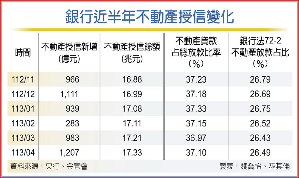 金管會主管的銀行法72-2條是控管銀行的不動產授信上限,不得超過放款及金融債券總額的30%,在2021及2022年都曾升至27%以上,今年前四月則都維持在26.4%到26.75%之間,偶爾有銀行逾29%,金管會都持續控管中。