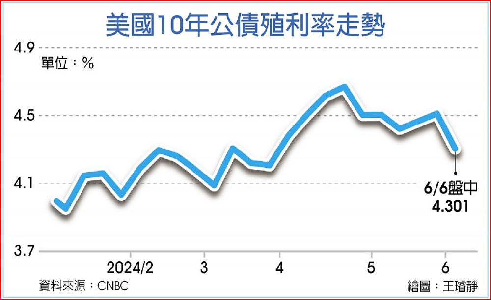 投資人觀望5月非農就業報告等最新經濟數據發布,從中評估降息前景,6日美債殖利率盤旋在近期低檔。10年期美債殖利率升5日摜破4.3%支撐,創2個多月新低,6日揚升不到1個基點,來到4.293%;2年期美債殖利率持平在4.734%。