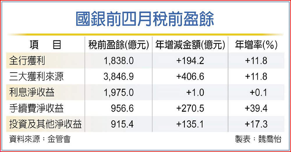 但國銀前四個月獲利動能仍強勁,累計已賺1,838億元,創同期新高。獲利三支柱皆較去年同期增加,增加最多的是手續費淨收益,累計已有957億元、年增39%,主要是股市大漲加上美國升息,投資面買債又買股,國銀財管手續費增加。