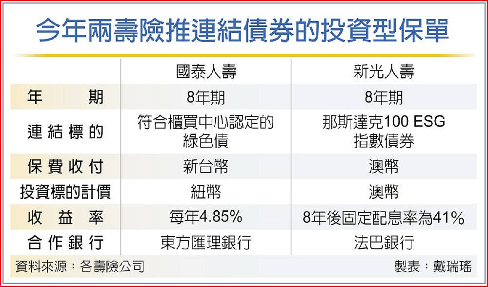 這是國壽今年推出的第二張投資型保單,今年第一張是連結多檔基金,訴求偏好自主投資的客群;而去年推出的澳幣投資型保單,連結的是一般普通公司債,這次新推出的是新台幣收付、投資標的為紐幣計價,連結為符合櫃買中心認定的綠色債。