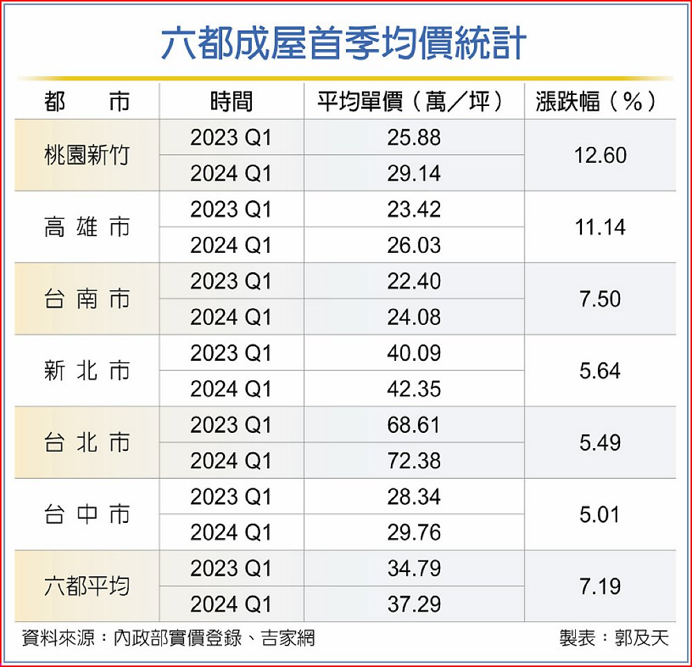 根據第一季房價統計,桃竹年漲幅12.6%居冠,高雄11.14%居次、台南7.5%,其餘三都也都有5%以上年漲幅,近一季漲幅前十行政區,新北市獨占四名、高雄市占三名,顯示短期新北市與高雄市房價漲勢增強。