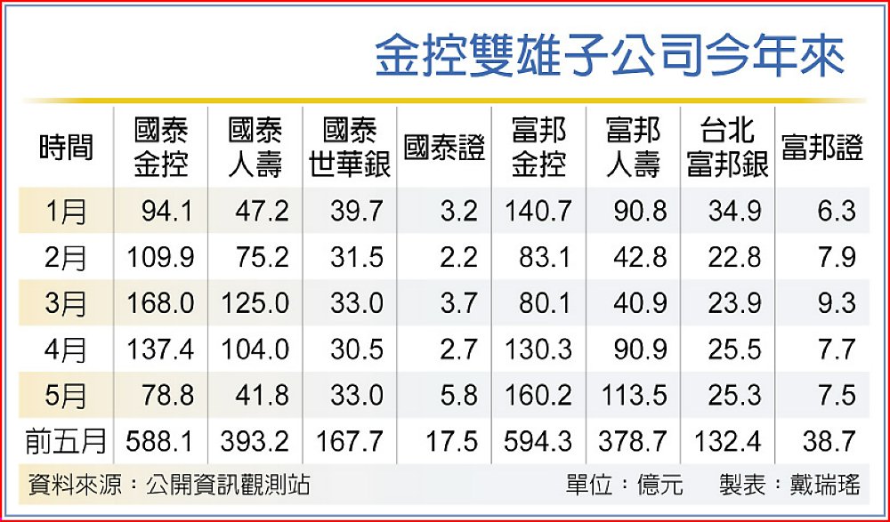 前五月國泰金拿下2月到4月三個月的單月獲利王,富邦金則是1月及5月的單月冠軍,除了壽險子公司給力,兩金控亦拚銀行獲利,國泰金下的國泰世華銀今年以來,月月賺逾30億元,累計前五月稅後貢獻167.7億元,創歷史新高;台北富邦銀今年以來亦每月賺逾22億元,最高近35億元,前五月稅後純益132.4億元,亦是其歷史新高。