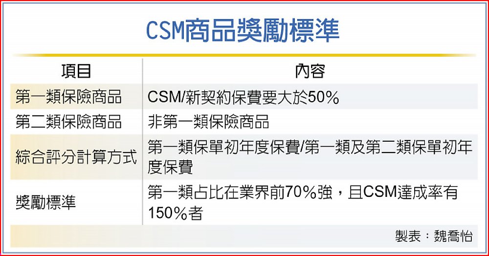 金管會未來鼓勵業者多推「第一類商品」,即CSM/新契約保費要大於50%(幾乎等同保費50%可作為壽險公司的收益)的保單,若第一類保單占所有新契約保費的比率,能排名市場前70%強(即前30%的公司),約六至七家,同時CSM達成率150%者,可申請國外投資多1個百分點,或不計算國外投資者(如外幣傳統保單)可增加2個百分點,金管會表示獎勵政策6月底就會出爐。