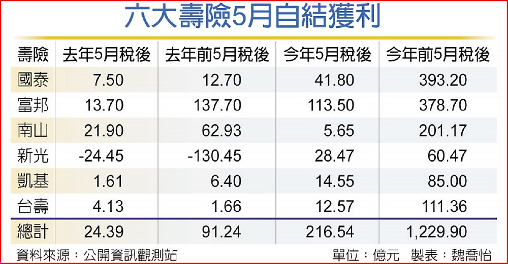 前四月新台幣兌美元趨貶,六大壽險都還有兌換利益,5月則有損失,各家趁台股站上21,000點,實現股票資本利得;前五月台股上漲逾18%,握有不少權值股、電信及科技股的六大壽險公司,亦趁機實現近2,000億元的資本利得,5月底帳上也還有股票未實現利益,6月還有支撐。